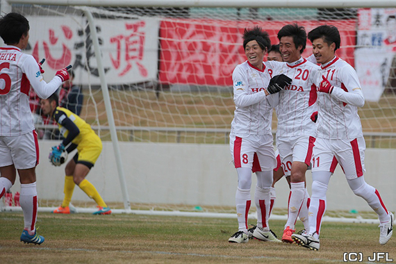 ラインメール青森とHonda FCは「新青森球」で対戦。Hondaは前半9分に左からのクロスボールを栗本広輝が決め先制、15分には相手クリアボールを古橋達弥が詰め、38分には香川大樹がドリブルから決め3点リードで折り返す。後半は52分に右CKからのボールをゴール前で繋ぎ最後は古橋が頭で決め計4ゴールで快勝。次節勝てば、セカンドステージ1位が確定、青森の1位はなくなった。